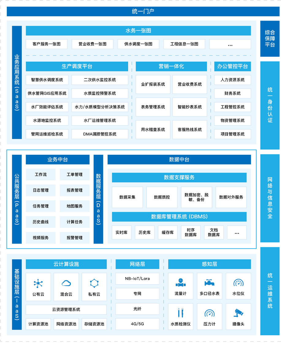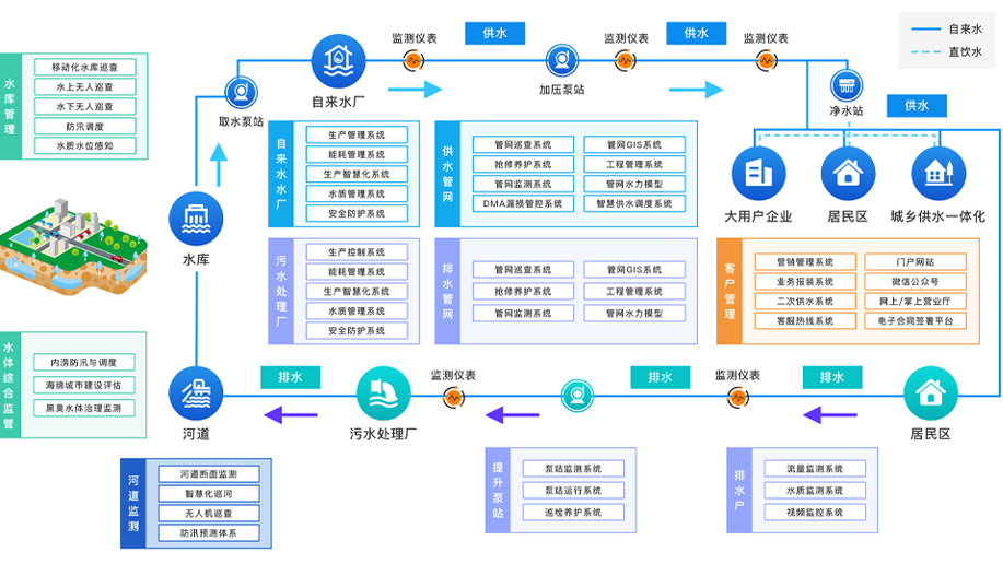 智慧水务建设产品及服务涵盖水源地、水厂、管网、二次供水等从“源头到龙头”城镇供水系统。利用云平台、大数据、物联网等技术手段,打通SCADA、GIS、DMA、水质监控、营业收费、二次供水系统、泵站监控、安防视频、生产自控、用水报装、客服系统、资产管理、OA等水务应用子系统,消除信息孤岛与数据烟囱,实现数据共享,建立协同运营管理模式,降低事故风险及企业运营成本,辅助企业决策目的。